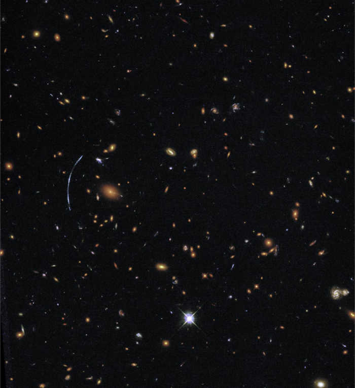 The gravity of a giant cluster of galaxies between the target galaxy and Earth distorts the more distant galaxy's light, stretching it into an arc and also magnifying it almost 30 times.