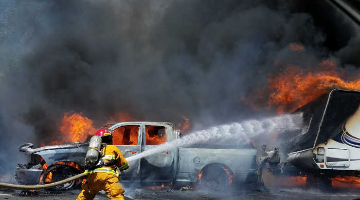 Witnesses at the scene reported that the Grade fire began when a pickup pulling a motorhome on Highway 101 burst into flames, catching a nearby hillside on fire.