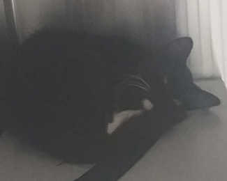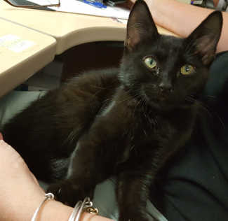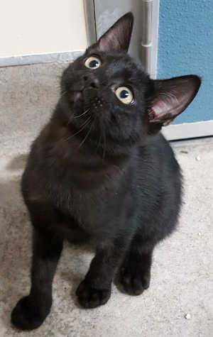 This male domestic short hair has an all-black coat and gold eyes.