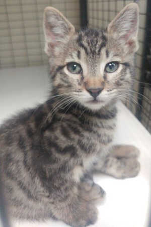 This young female domestic short hair mix has a gray tabby coat and green eyes.