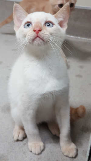 This young male flame point has a short coat and blue eyes.