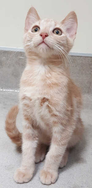 This young male domestic short hair cat has an orange tabby and cream-colored coat and gold eyes.