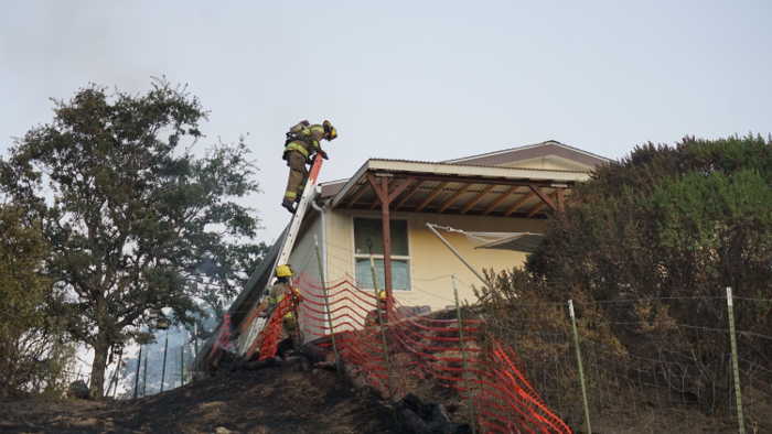 Hours after the fire was out, firefighters continued to wet down the burned structures and the surrounding vegetation, with fire hoses lining the roadway.