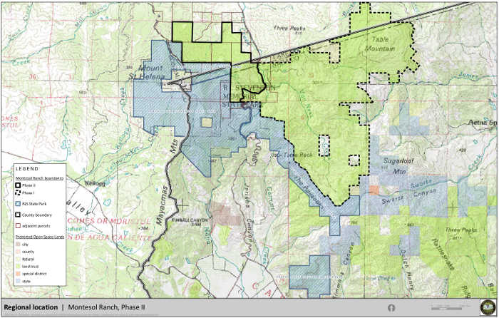 The two organizations also have obtained an option to purchase in fee title the 1,254 acres of the Montesol Ranch located west of Highway 29. About 1,000 acres of the Phase II area is located in Lake County.