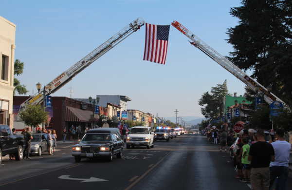 Two fire ladder trucks sat on either side of the street at Main and Third streets, an American flag draped between them for the hearse and its escort to pass under.
