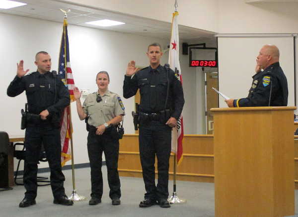 During a formal swearing-in ceremony at City Hall on Thursday, Aug. 31, Mauricio Barreto and Jonathon Reynolds took their oaths as police officers and Officer Melinda Wymer was sworn in as a new animal control officer, according to City Manager Greg Folsom.