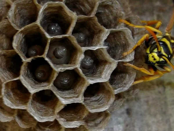 Paper wasps, on the other hand, usually build their much smaller nests under overhangs or in tight corners (usually with only about 100 chambers in them). Each nest usually consists of only one “chandelier” (or “umbrella”) of egg repositories, and is open to the air (without the paper covering the Yellow Jackets use.)