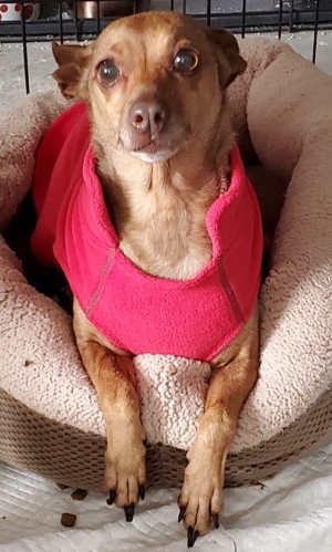 “Roxy” is a female Miniature Pinscher with a short red coat.