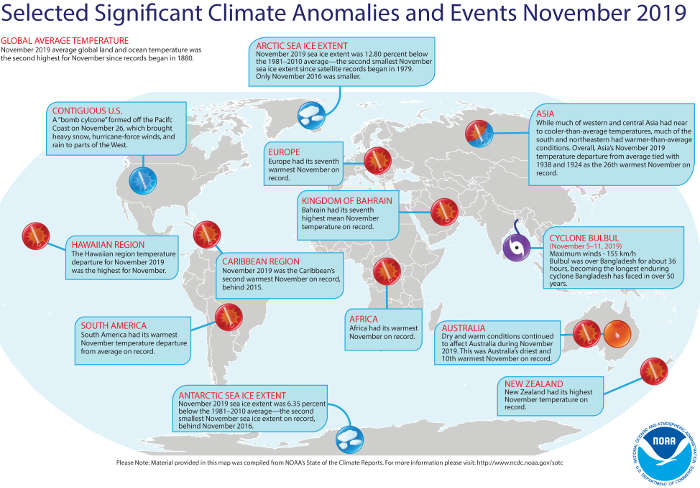 – Sea-ice coverage shrank to its second-lowest size on record for November in both the Arctic and Antarctic behind that observed in November 2016. Arctic sea ice coverage was 12.8 percent below the 1981–2010 average, while the Antarctic coverage was 6.35 percent below average.