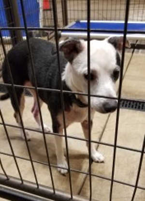 “Cow” is a female terrier mix with a short black and white coat.