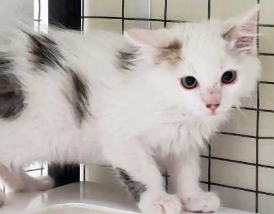 “Bones” is a male domestic long hair kitten with a gray tabby and white coat and green eyes.