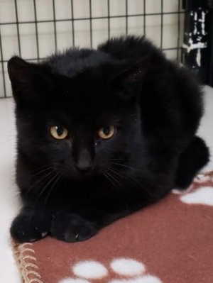 This female domestic short hair kitten has an all-black coat and gold eyes.
