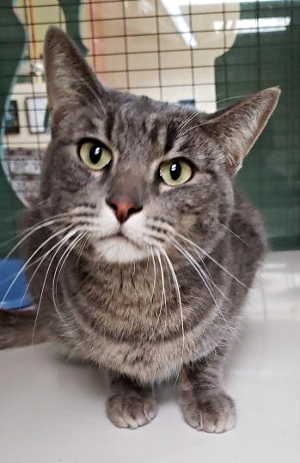 This female domestic short hair has a gray tabby coat and green eyes.