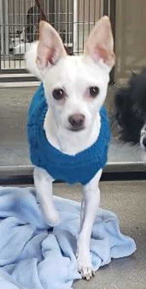 “Pessie May” ia a female Chihuahua with a short white and tan coat.