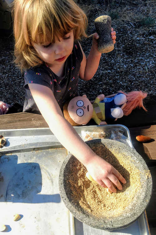 The public was invited to try their hand at cracking and grinding acorns at the community garden at the Lake County Tribal Health Consortium in Lakeport, Calif. Photo by Esther Oertel. LAKE COUNTY, Calif. – The sun was warm and bright on a recent fall day when my granddaughter and I visited the community garden on the campus of the Lake County Tribal Health Consortium in Lakeport.