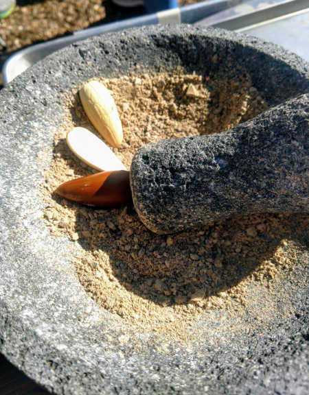 Once dried, the acorn meat can be ground into flour. The traditional method for this is with a stone mortar and pestle, though a nut grinder, blender or food processor can be used. Franklin prefers the more time-consuming method of mortar and pestle, as it helps one to slow down and appreciate the effort that goes into food preparation.
