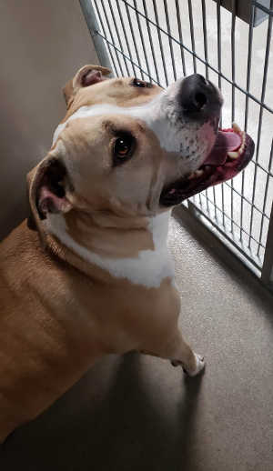 “Max” is a male pit bull terrier with a short tan and white coat.