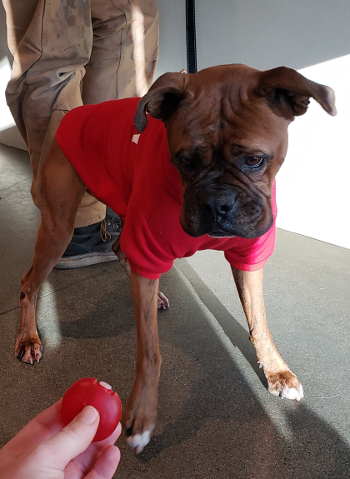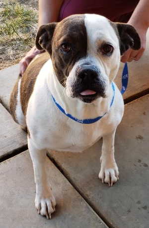 “Athena” is a female boxer with a medium-length brown and white coat.