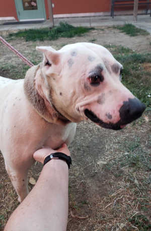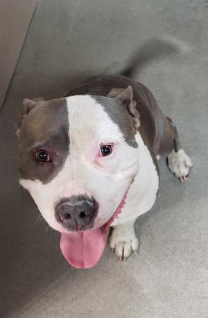 “Tatum” is a male pit bull terrier has a shot gray and white coat.