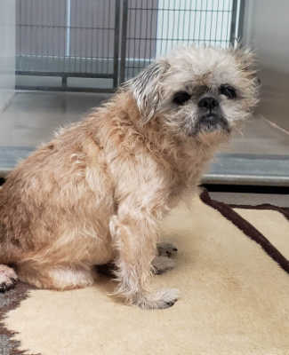 “Scruffy” is a female Brussels Griffon with a medium-length tan coat.