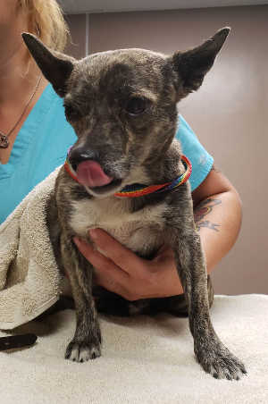 This male Chihuahua has a short brindle coat.