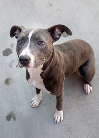 This female pit bull terrier has a short blue and white coat.