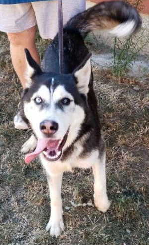 “Scrappy” is a male husky with a medium-length black and white coat and blue eyes.