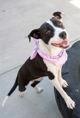 This female pit bull terrier has a short black and white coat.