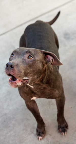 This female pit bull has a short gray coat.