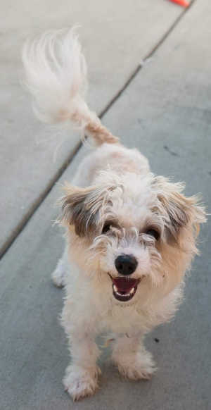 This male Shih Tzu has a curly tan and white coat.