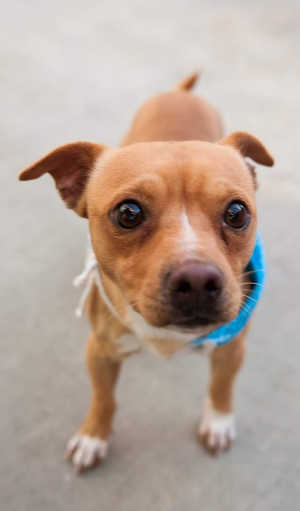 This male Chihuahua has a short brown and white coat.