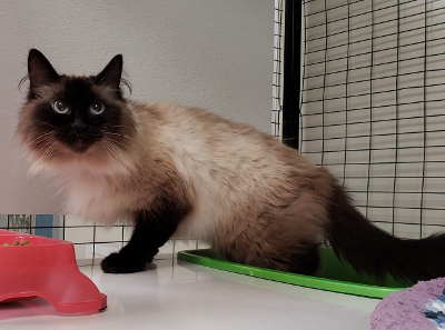 This female domestic long hair cat has a seal point coat with blue eyes.