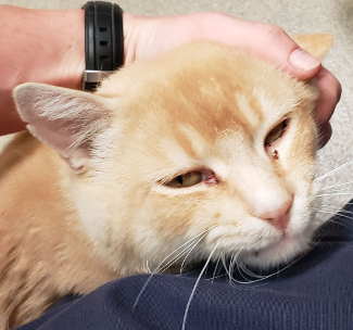This male domestic short hair cat has a flame point coat and blue eyes.
