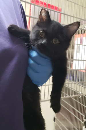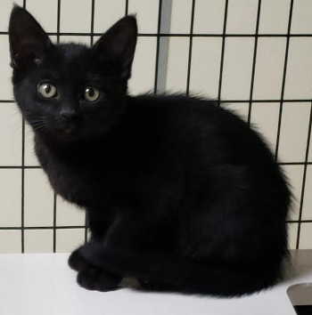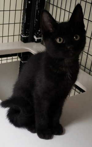 This male domestic short hair kitten has a black coat and green eyes.