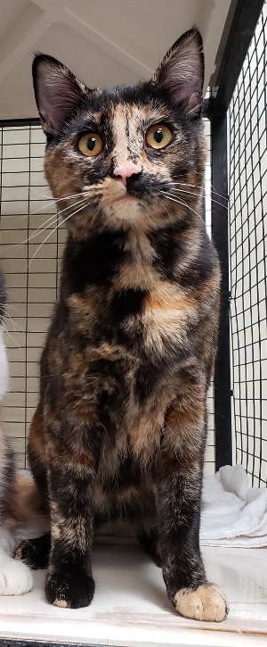 This female domestic short hair has a tortoiseshell coat and gold eyes.