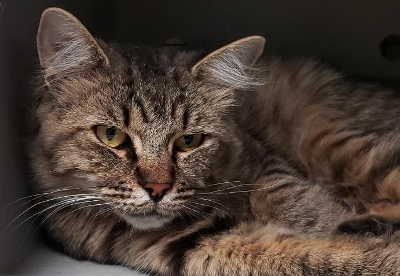 This male brown tabby has a long coat and green eyes.