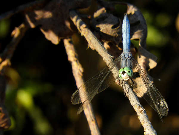 Blue dashers will raise their abdomens in the obelisk position and orient their bodies to the sun in order to reflect light off that pruinocity and flash bright-white warnings to other males to stay off their turf.