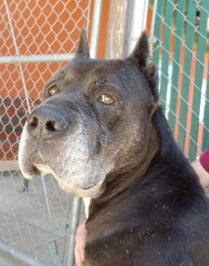“Nova” is a female Cane Corso mastiff with a short black coat.
