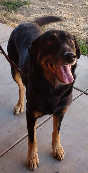 “Ace” is a male Rottweiler-shepherd mix with a medium-length black and brown coat.