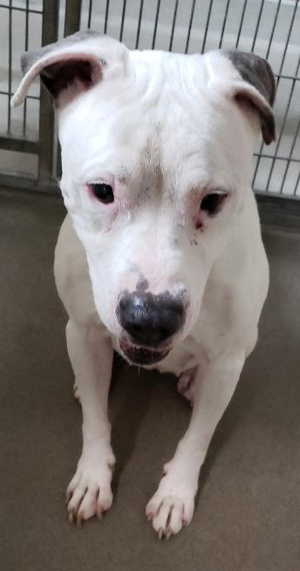 “Boo” is a senior female terrier-pit bull mix with a short white and gray coat.