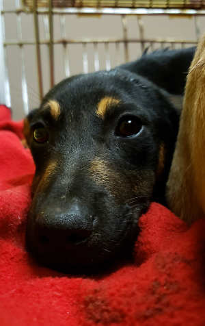 “Lucy” is a female Labrador Retriever with a short black and tan coat.