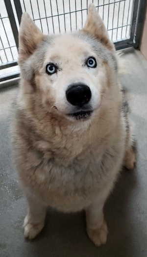 “Kiko” is a senior male Alaskan Malamute with a long white and gray coat and blue eyes.