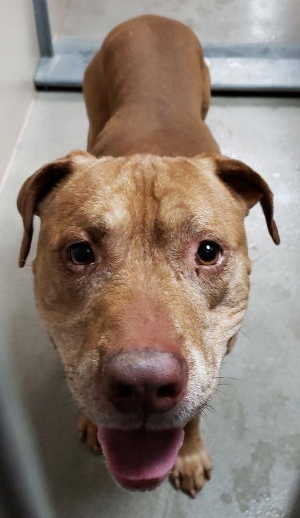 “Corn” is a male American Staffordshire Terrier with a short red coat.