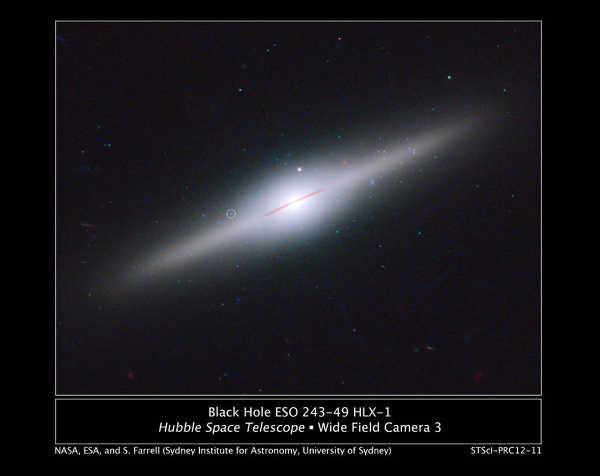 A 2012 study using NASA's Hubble and Swift space telescopes found suggestions of a cluster of young blue stars orbiting this object. It may have once been the center of a dwarf galaxy that was swallowed by the larger galaxy ESO 243-49. Many scientists consider HLX-1 a proven intermediate-mass black hole, Harrison said.