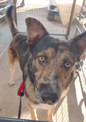 “Chase” is a male shepherd mix with a medium-length brindle coat.
