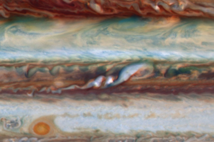 A closeup of the two bright white plumes (center) in the South Equatorial Belt of Jupiter and a large downstream disturbance to their right. Image by Imke de Pater, UC Berkeley; Robert Sault, University of Melbourne; Chris Moeckel, UC Berkeley; Michael Wong, UC Berkeley; Leigh Fletcher, University of Leicester. Storm clouds rooted deep in Jupiter’s atmosphere are affecting the planet’s white zones and colorful belts, creating disturbances in their flow and even changing their color.