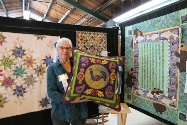 This hand dyed felted wool pillow shown off by Lake County Quilt Guild member Marianne Mulheren of Ukiah, Calif., uses hand applique, embroidery and beading. Photo by Suzanne Lee. LAKEPORT, Calif. – The Ladies of the Lake Quilt Guild present the 18th annual Falling Leaves Quilt Show in Fritch Hall and Little Theatre at the Lake County Fairgrounds in Lakeport on Saturday, Oct. 5, and Sunday, Oct. 6.