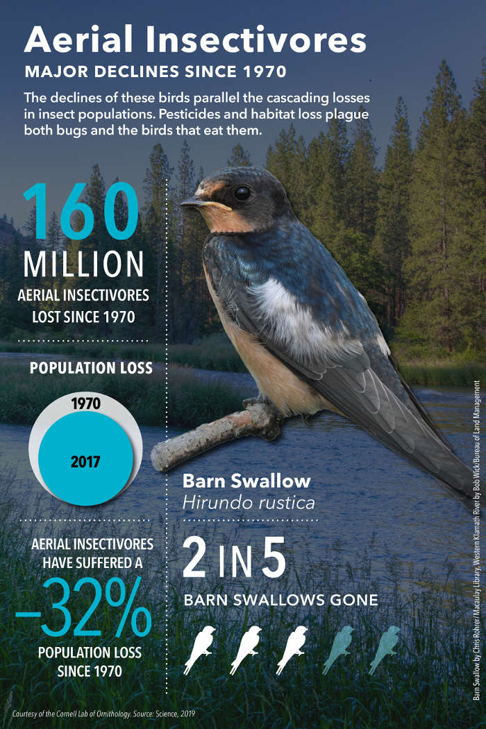 Other studies have documented mortality from predation by free-roaming domestic cats; collisions with glass, buildings, and other structures; and pervasive use of pesticides associated with widespread declines in insects, an essential food source for birds. Climate change is expected to compound these challenges by altering habitats and threatening plant communities that birds need to survive. More research is needed to pinpoint primary causes for declines in individual species.