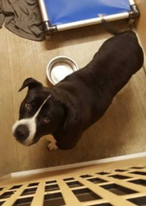 “Frank” is a male American Staffordshire Terrier mix with a short black and white coat.