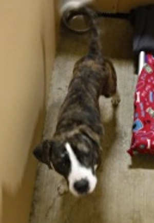 “Bernard” is a male Staffordshire Bull Terrier mix with a short brindle and white coat.